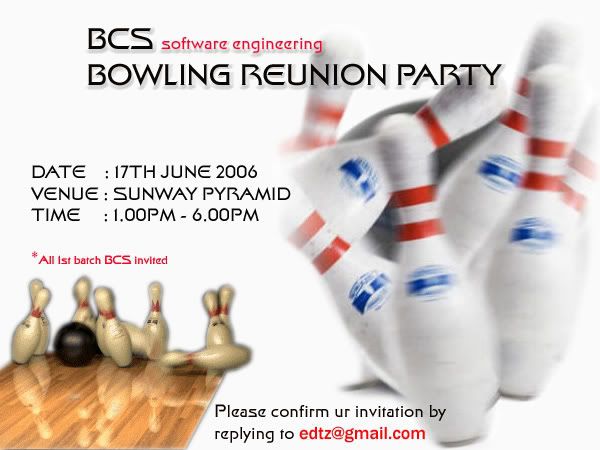 Yeah....the bowling reunion party...sound goods....all BCS 1st batch invited....Here we rock..!!!!